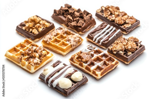 Assorted waffles with various toppings arranged on a plain white background