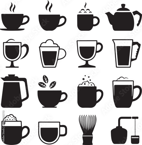 Assortment of black and white hot beverage and tea icons Keywords: drink, beverage, hot, coffee