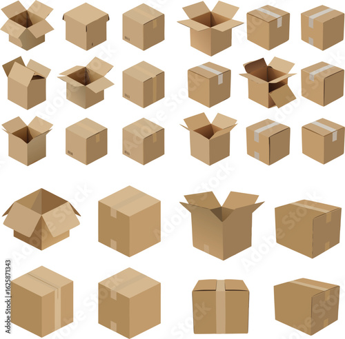 Assortment of Brown Cardboard Boxes Open, Closed, Taped, Packaging Variety and Options