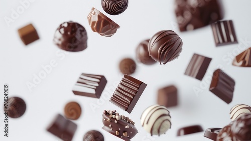 Assortment of chocolate candies and sweets flying in the air on white background. Truffles, creamy milk bonbons, sweet food concept banner