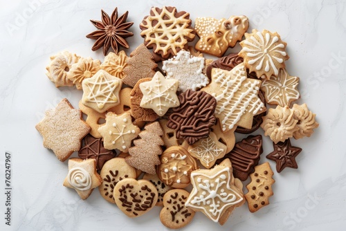 Assortment of Christmas shaped cookies in a pile on white table. Top view. Horizontal composition.