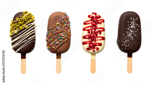 Assortment of cold summer popsicles isolated on transparent background. Colorful popsicle isolated on white, chocolate popsicle bar isolated on white, png chocolate bar popsicle