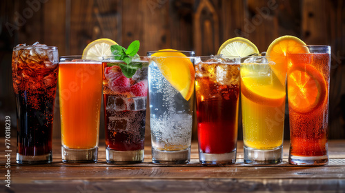 Assortment of colorful drinks lined up on wooden bar, ideal for festive occasions