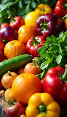 Assortment of colorful fruits and vegetables arranged in a vibrant display , healthy, foods