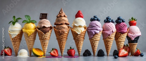 Assortment of Colorful Ice Cream Cones Featuring Varied Flavors Including Coffee, Mango, Chocolate, Vanilla, Strawberry and More