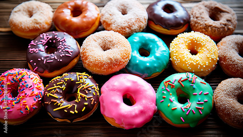 assortment of colorfully glazed donuts, scattered playfully across a light, flat wooden background, Generative AI