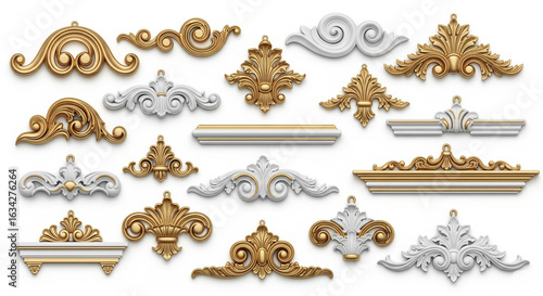 Assortment of decorative gold and white architectural ornaments arranged on a white background surface
