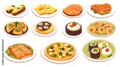 Assortment of Delicious Dishes Including Fish, Pasta, and Desserts