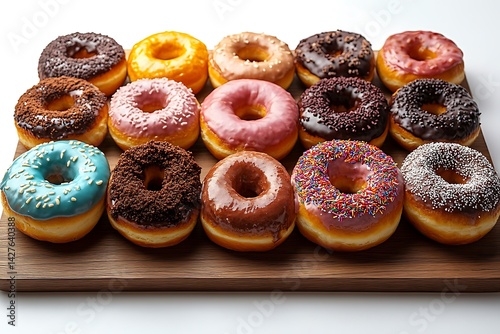 Assortment of delicious donuts on wooden board ready for sharing