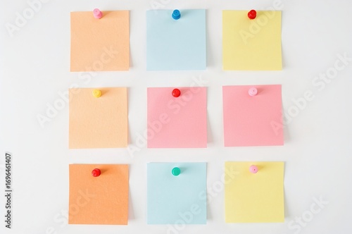 Assortment of different sticky notes pinned to a surface, each photographed individually
