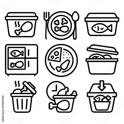 Assortment of Food Icons Chicken Fish Pizza and Disposal Concepts.