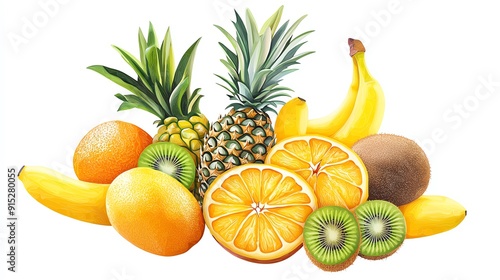 Assortment of fresh fruit including pineapple, banana, orange, kiwi and mango.