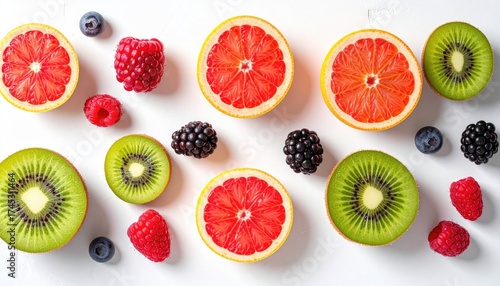 Assortment of Fresh Fruits Overhead Shot on Bright White Background Featuring Red Grapefruit Kiwi Raspberries and Blackberries with Natural Lighting