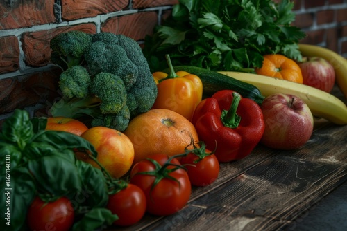 assortment of fresh vegetables and fruits on a wooden table, with bright colors and natural lighting