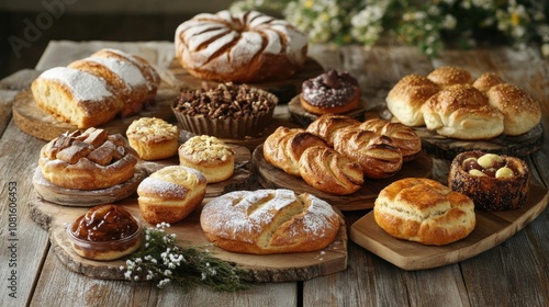 Assortment of freshly baked breads, pastries, and donuts on rustic wooden table.