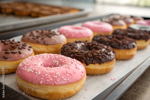 Assortment of Freshly Baked Donuts with Pink and Chocolate Frosting