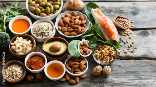Assortment of healthy foods including nuts, seeds, olives, avocado, fresh salmon, leafy greens, broccoli, and oil on a rustic wooden table.