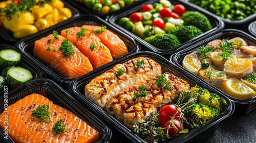 Assortment of healthy prepared meals in black containers featuring fish and various vegetables close up
