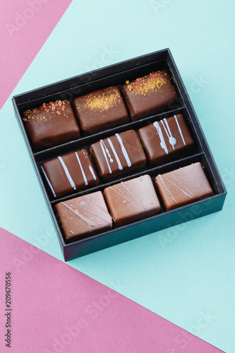Assortment of luxury bonbons in box on colorful purple and blue background