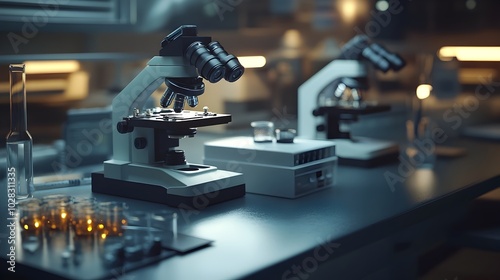 Assortment of Microscopes and Scientific Equipment on a Laboratory Desk