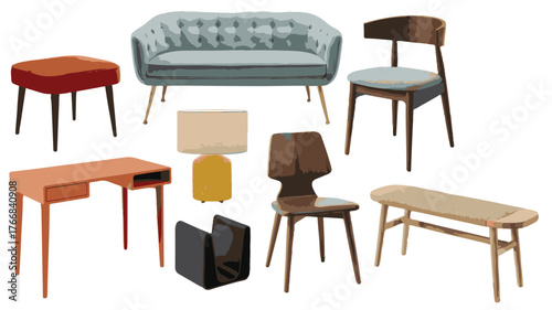 Assortment of Mid- Century Modern Furniture Pieces on White Background mid century modern furniture