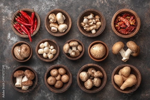 Assortment of Mushrooms and Chili Peppers in Wooden Bowls