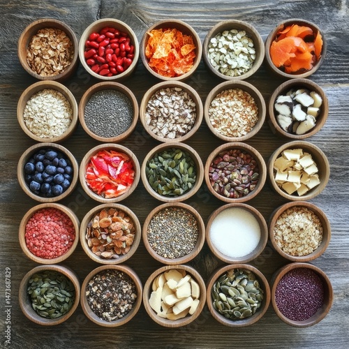 Assortment of nutritious ingredients in small bowls, arranged in a grid pattern on a wooden surface