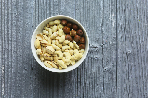 Assortment of nuts on a dark wooden table. View from above