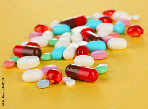 Assortment of pills, tablets and capsules on yellow background