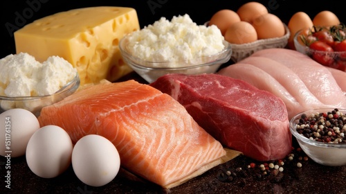Assortment of protein rich foods including meat fish dairy and eggs.