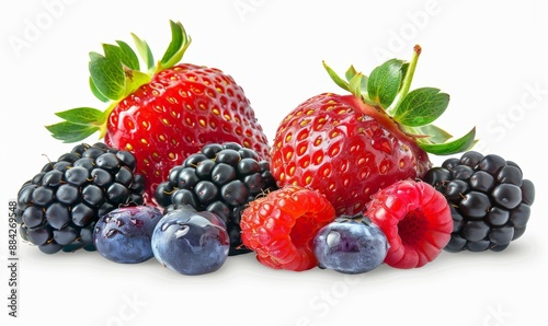 Assortment of ripe strawberries, blueberries, blackberries, and raspberries isolated against a white background