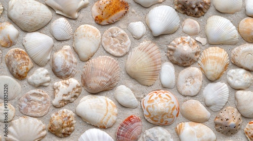 Assortment of seashells on sandy beach