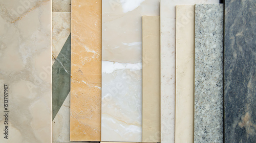Assortment of Stone and Tile Samples: A variety of natural stone and tile samples displaying various textures and color palettes for interior design inspiration.