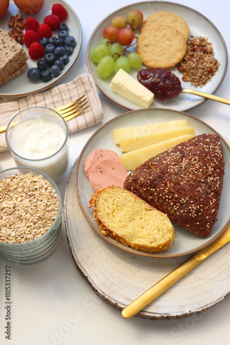 Assortment of various breakfast foods and drinks on the white table. Selective focus.