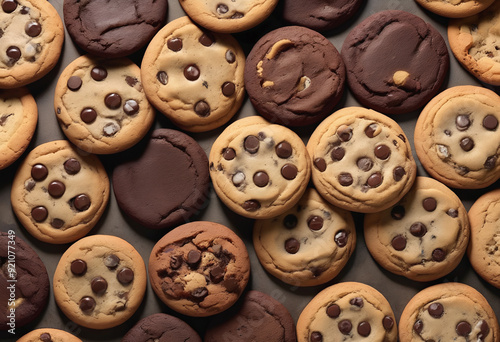 Assortment of various chocolate chip cookies, showcasing different textures and flavors. Ideal for food, dessert, and baking themes