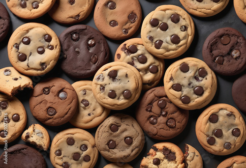 Assortment of various chocolate chip cookies, showcasing different textures and flavors. Ideal for food, dessert, and baking themes