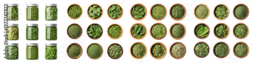 Assortment of various superfood green powders pastes and blended ingredients including spirulina moringa matcha wheatgrass chlorella and other nutrient dense plant based superfoods for healthy eating