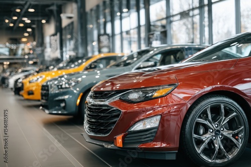 Assortment of vehicles showcased at an automobile dealership, featuring a red sedan in the foreground, available for sale.