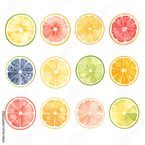 Assortment of vibrant, stylized citrus fruit slices including lemon, lime, orange, grapefruit, and a unique blue variety.