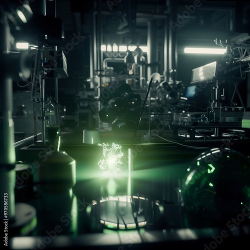 Astatine Element Glowing Faintly in a Dark Lab, Surrounded by High-Tech Scientific Equipment, Emitting a Mysterious Radioactive Light, Ultra-Detailed 8K