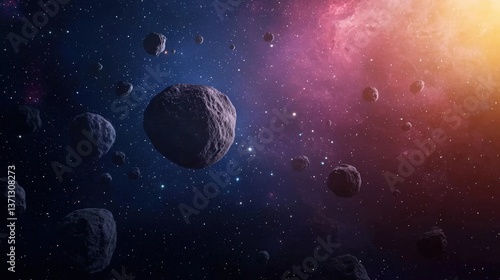 Asteroids floating in space cosmic chaos digital art vibrant nebula background high-quality render