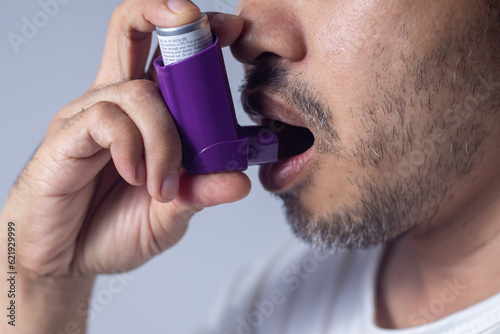 Asthma patient inhaling medication to treat Treatment of allergic asthma and the concept of chronic lung disease