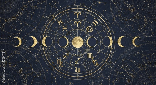 Astrological chart with zodiac signs and moon phases, detailed and intricate design.