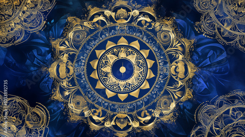 Astrological mandala design, mystical mood, gold and blue patterns, copy space