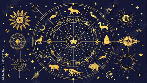 Astrological Zodiac Tattoo Design with Golden Celestial Symbols on Dark Background