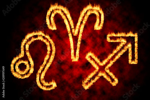 Astrology, sign belonging to the fire element and horoscope conceptual idea with the astrological signs of the Leo, Taurus and Sagittarius in blazing flame isolated on black background with red cloud