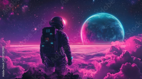 Astronaut gazing at neon planet amidst pink clouds in cosmic galaxy