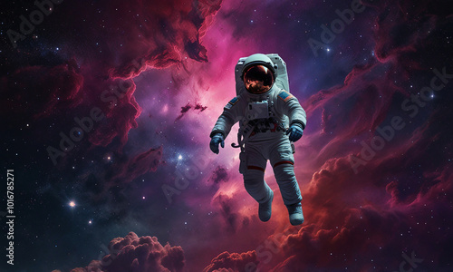 Astronaut Gliding Through a Vivid Cosmic Scene Filled with Colorful Nebulae and Distant Stars