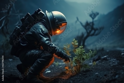 Astronaut growing plant, agriculture and farming on alien planet