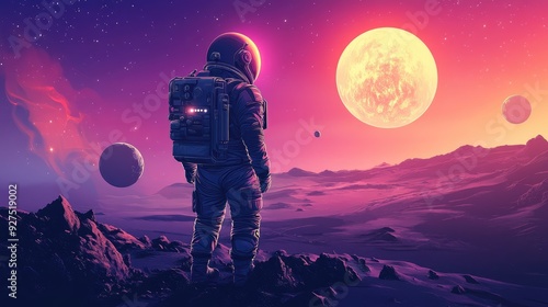 Astronaut in a high-tech space suit exploring the surface of a new planet, with a beautiful cosmic horizon and distant celestial bodies. Vector illustration with bright colors.